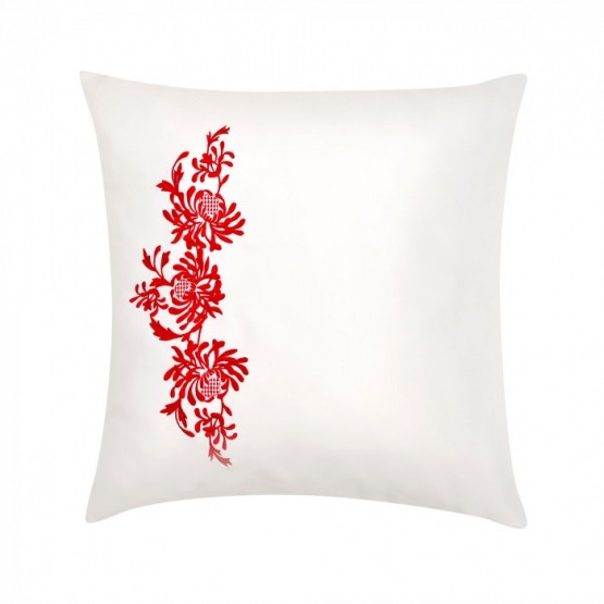 - Material fata de perna - tesatura poliester 96 % elastan 4%, de culoare alba, cu aspect lucios, satinat, fata pernei este brodata cu rosu, reprezentand flori de crizanteme, simbol de veselie, optimism , adevar; dosul pernei este din aceeasi tesatura, alb uni.